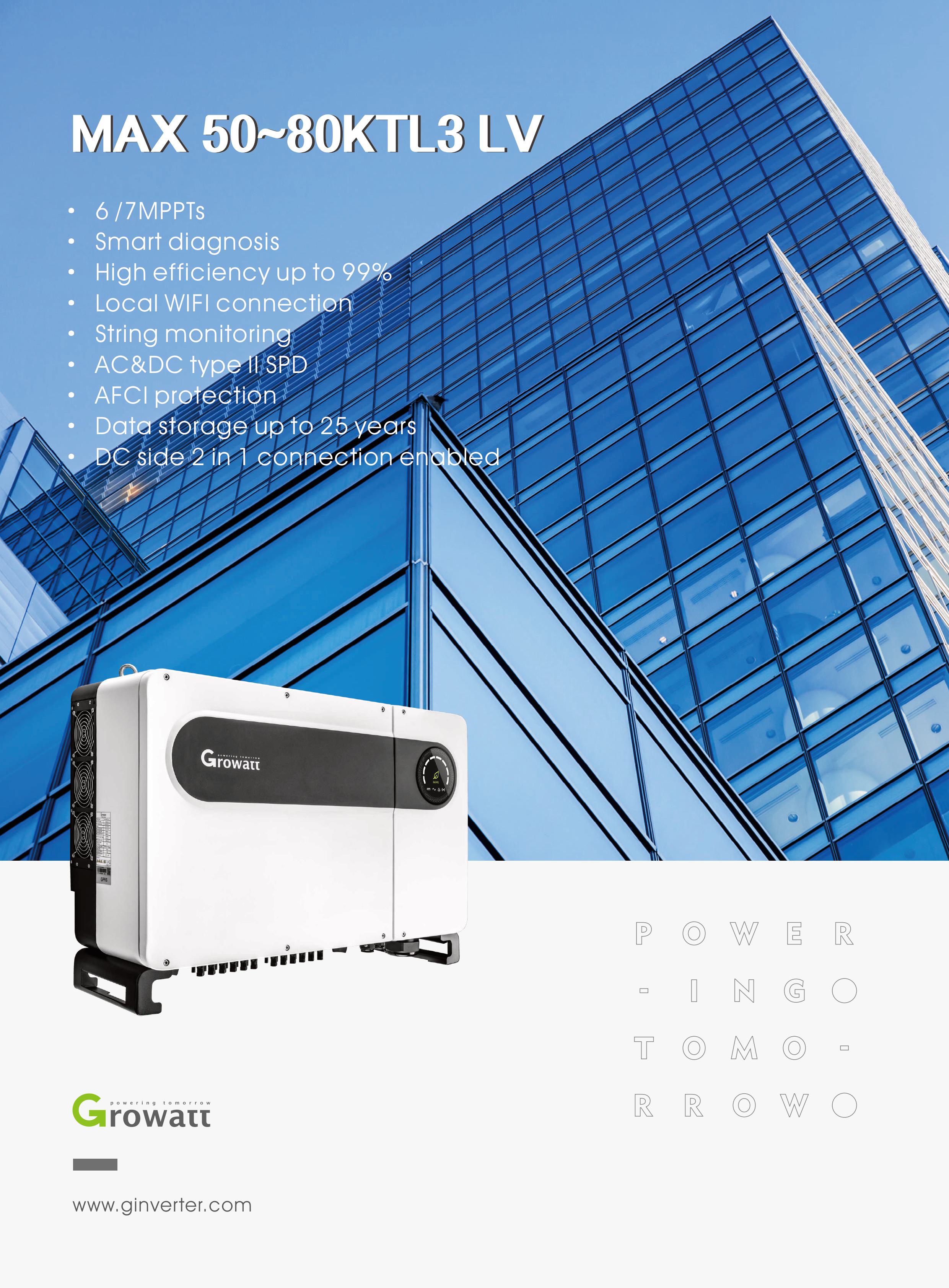 Biến tần Growatt 80kW – MAX 80KTL3 LV là dòng inverter công suất lớn, được thiết kế chuyên biệt cho hệ thống điện mặt trời công nghiệp và thương mại. Với hiệu suất đạt tới 99%, 7 MPPT – 14 strings, cùng khả năng lắp pin lên đến 104kWp, sản phẩm mang lại hiệu quả tối đa và độ tin cậy vượt trội cho mọi dự án.