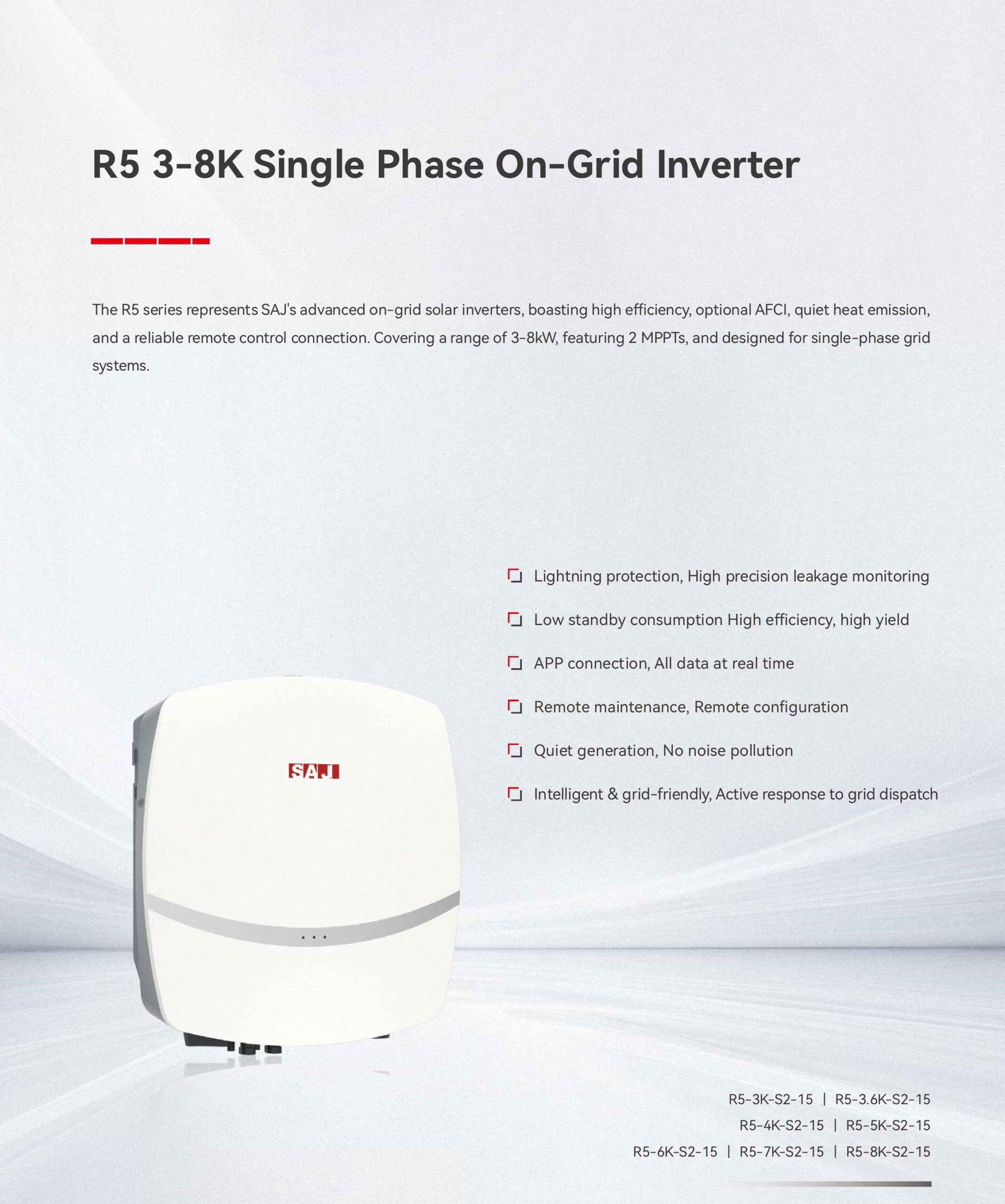Biến tần hòa lưới SAJ 1 Pha 8kW R5-8K-S2-15 là lựa chọn hoàn hảo cho các hệ thống điện mặt trời dân dụng và doanh nghiệp nhỏ, nơi yêu cầu hiệu suất ổn định, hoạt động êm ái và tuổi thọ cao. Với công nghệ tiên tiến của SAJ, thiết bị giúp tối ưu hóa nguồn năng lượng mặt trời, tiết kiệm chi phí điện năng, đồng thời vận hành bền bỉ trong mọi điều kiện môi trường.