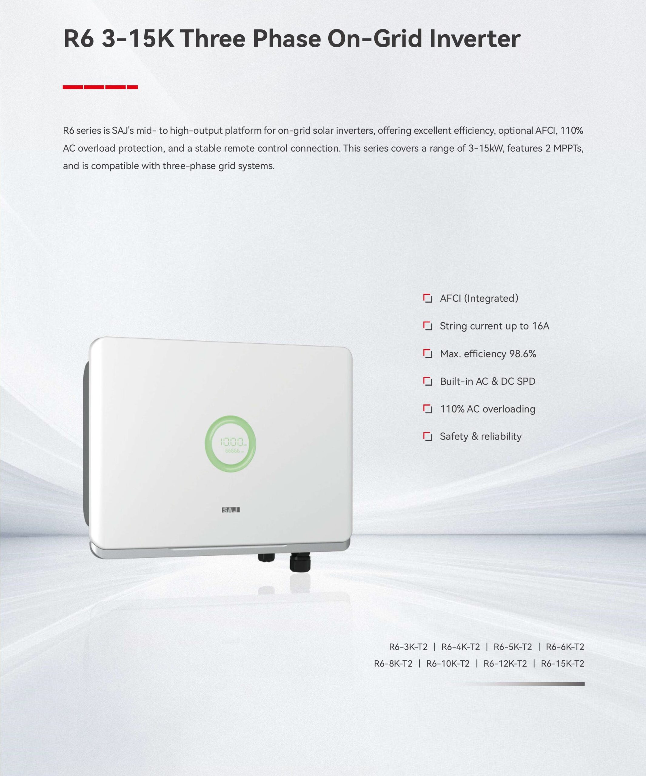 Biến Tần Hòa Lưới SAJ 3 Pha 10kW Cao Cấp – R6-10K-T2 là lựa chọn lý tưởng cho các hệ thống điện mặt trời dân dụng và thương mại quy mô vừa – lớn. Với thiết kế hiện đại, khả năng hoạt động ổn định và độ bền cao, sản phẩm giúp tối ưu hiệu suất khai thác năng lượng, giảm chi phí điện năng lâu dài.