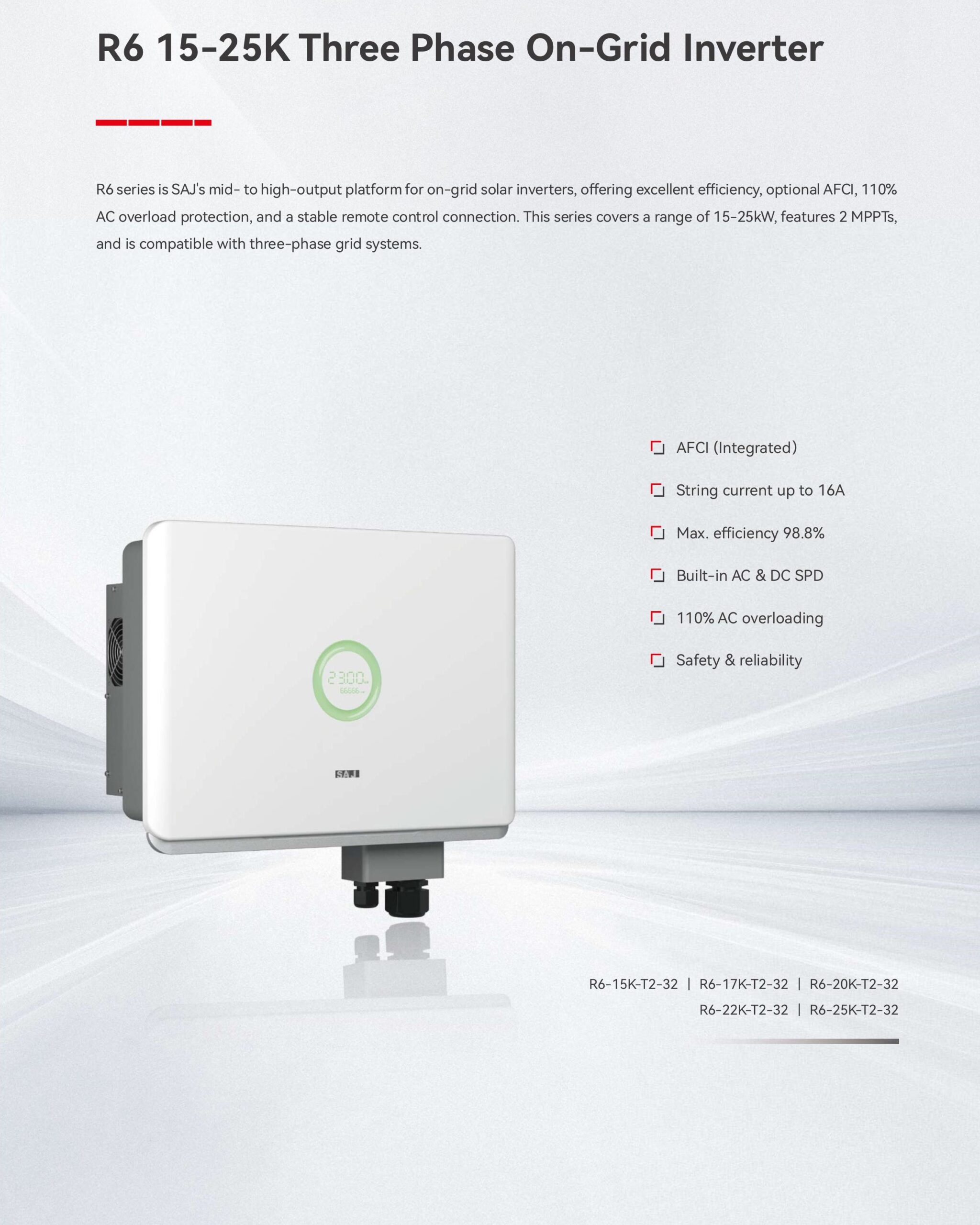 Biến Tần Hòa Lưới SAJ 3 Pha 25kW thuộc dòng R6 cao cấp – được phát triển bởi thương hiệu hàng đầu SAJ.