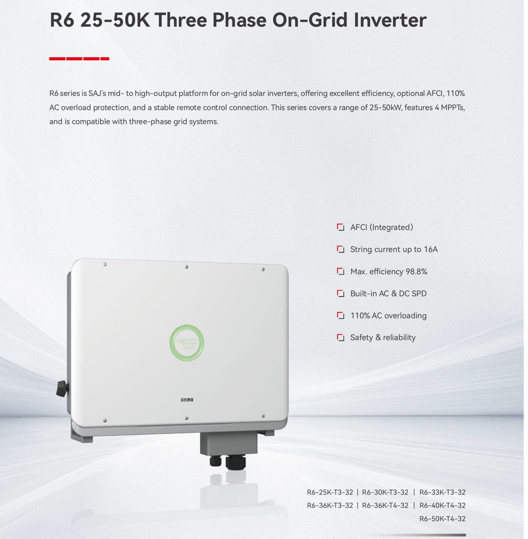Biến Tần Hòa Lưới SAJ 3 Pha 30kW là dòng sản phẩm thuộc thế hệ R6 cao cấp – được thiết kế dành cho các hệ thống điện mặt trời thương mại, công nghiệp hoặc nông nghiệp.