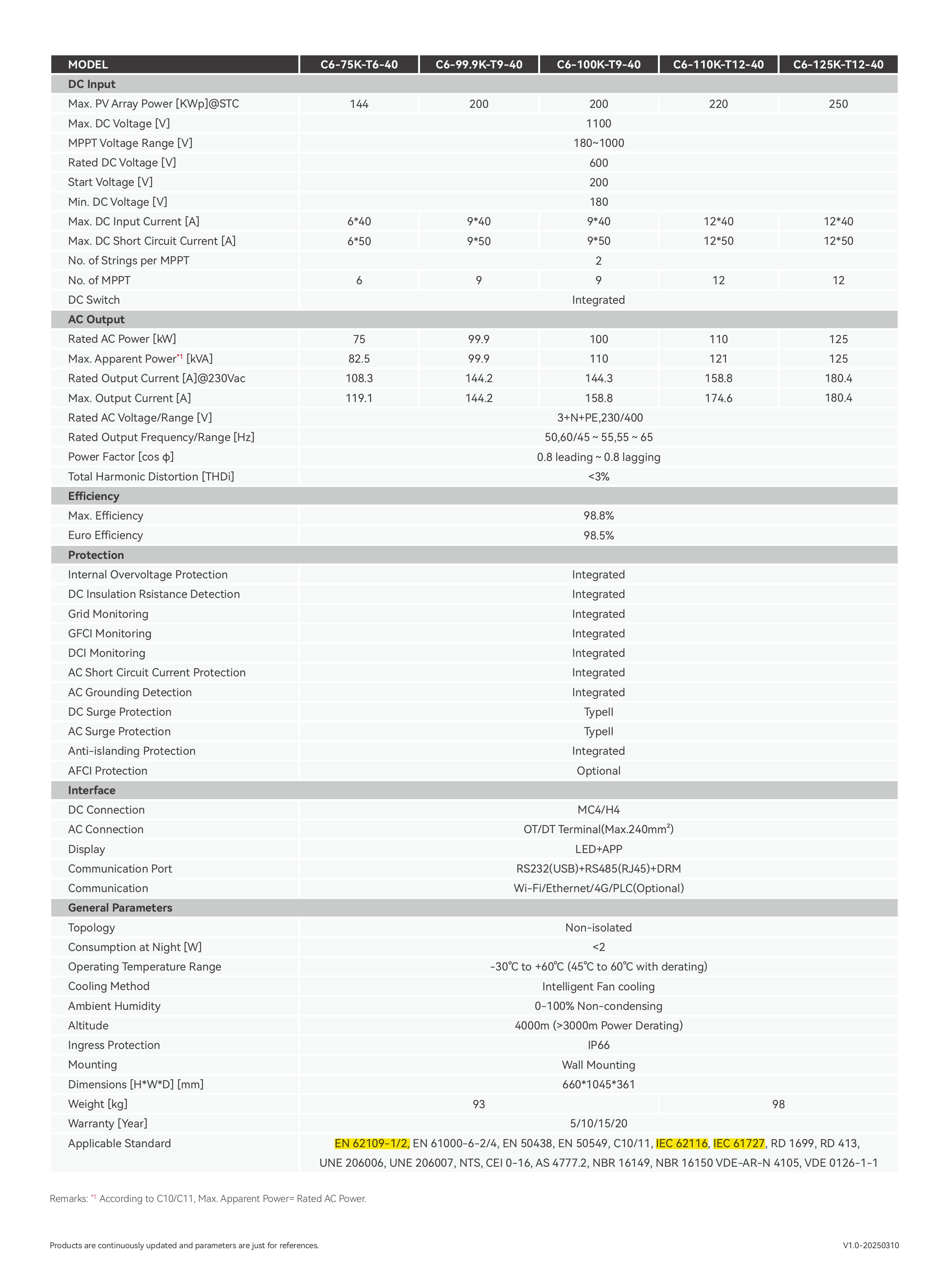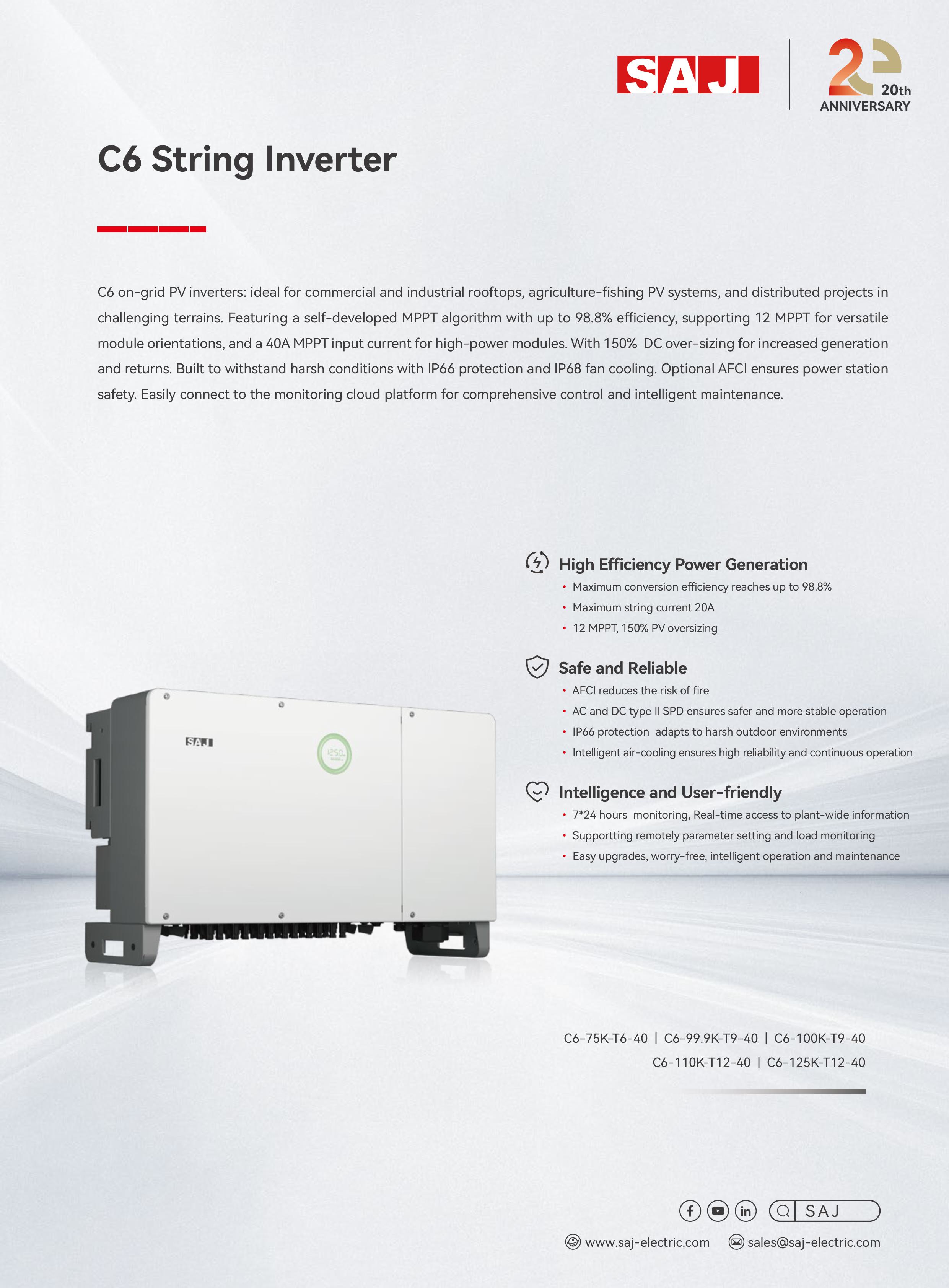Biến Tần Hòa Lưới SAJ 3 Pha 99.9kW là thiết bị công suất lớn thuộc dòng C6 cao cấp của SAJ, được thiết kế dành riêng cho các dự án điện mặt trời thương mại và công nghiệp. Với khả năng chịu tải vượt trội, tính năng bảo vệ thông minh và tuổi thọ cao, sản phẩm này đảm bảo hiệu quả đầu tư lâu dài và an toàn tuyệt đối cho hệ thống năng lượng.