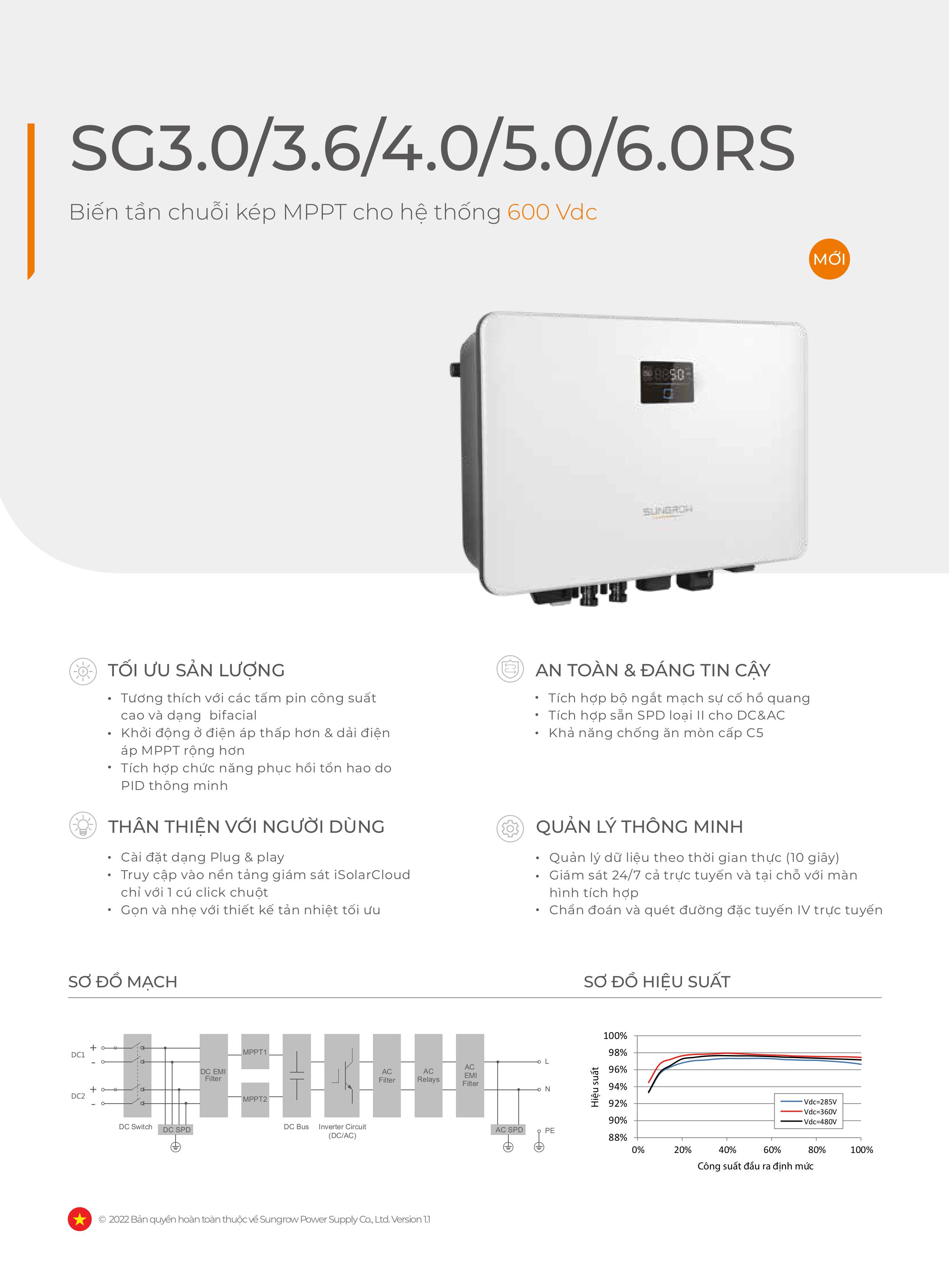 Biến Tần Sungrow 5kW 1 Pha – SG5.0RS là dòng sản phẩm hiệu suất cao, an toàn và thông minh, được thiết kế tối ưu cho hệ thống điện năng lượng mặt trời dân dụng. Với công suất 5 kW (AC), hiệu suất chuyển đổi lên đến 97.7% và bảo hành chính hãng 10 năm, đây là lựa chọn hoàn hảo cho những gia đình, hộ kinh doanh đang tìm kiếm giải pháp tiết kiệm năng lượng lâu dài.