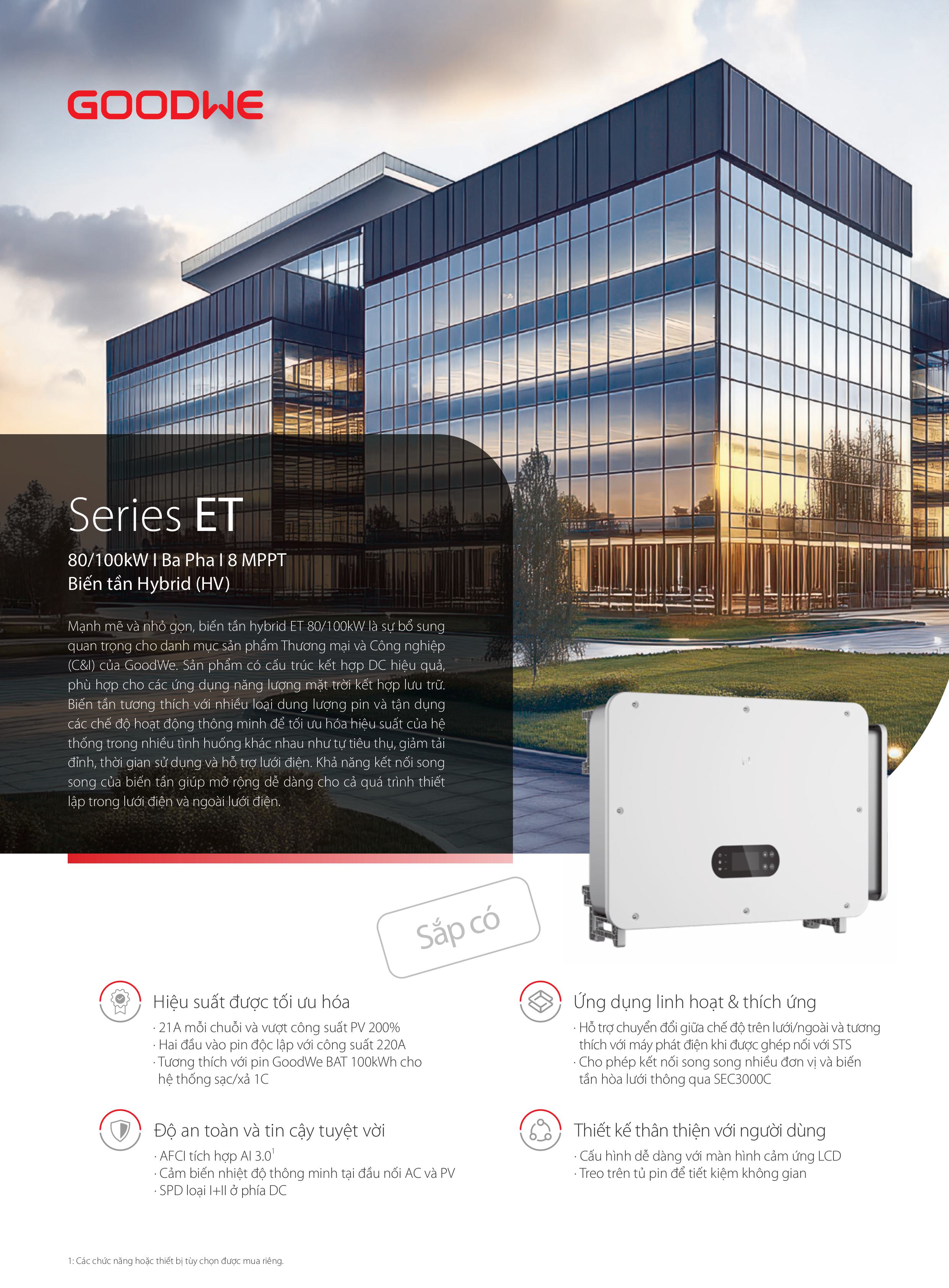 Inverter Hybrid 3 Pha Goodwe 80kW (GW80K-ET-G10) là dòng biến tần lai cao cấp thế hệ mới, được thiết kế cho các hệ thống điện mặt trời thương mại, nhà máy và khu công nghiệp quy mô lớn.