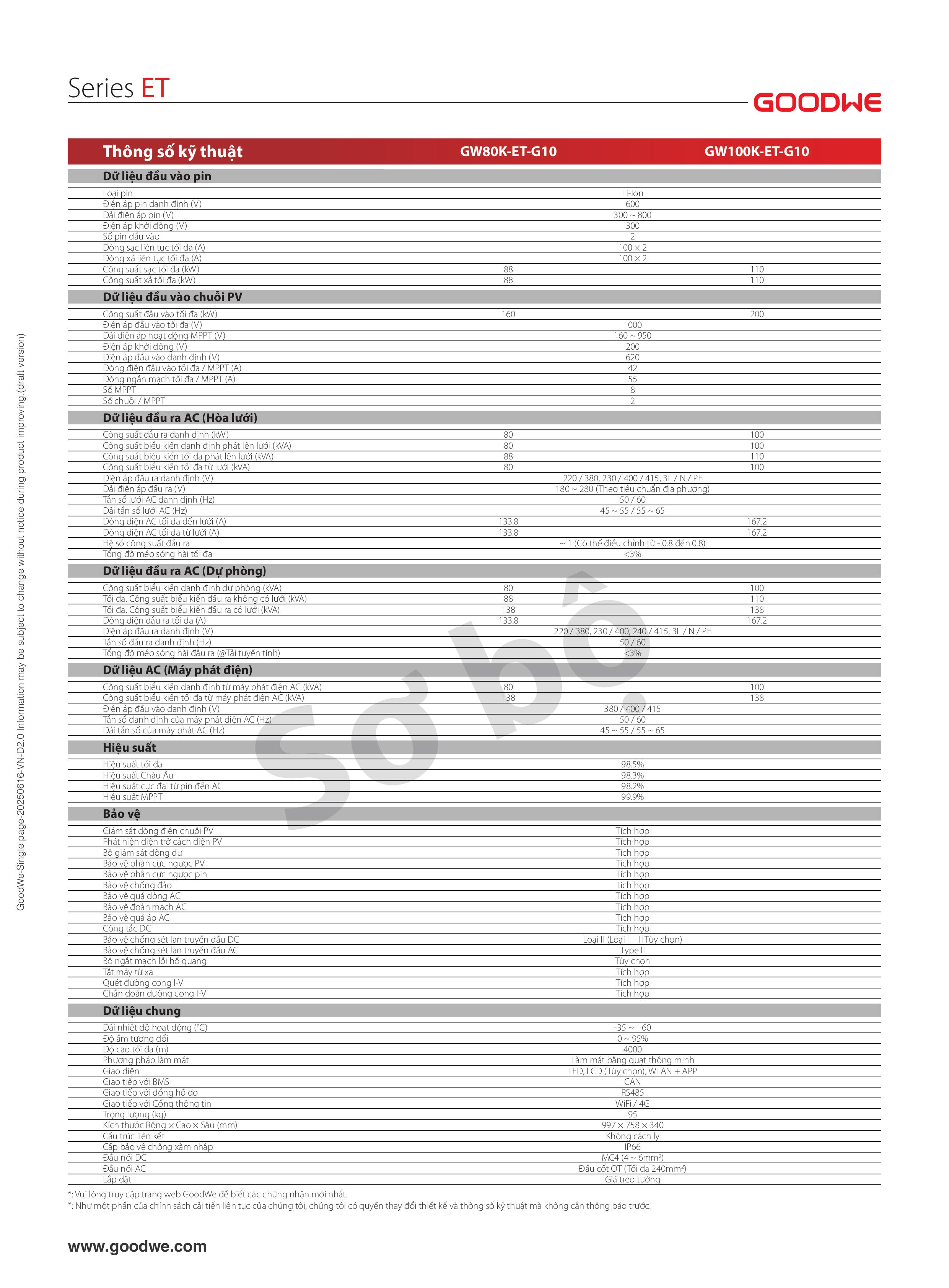 | Bảo hành | 10 năm (khi dùng chung battery của Goodwe) |