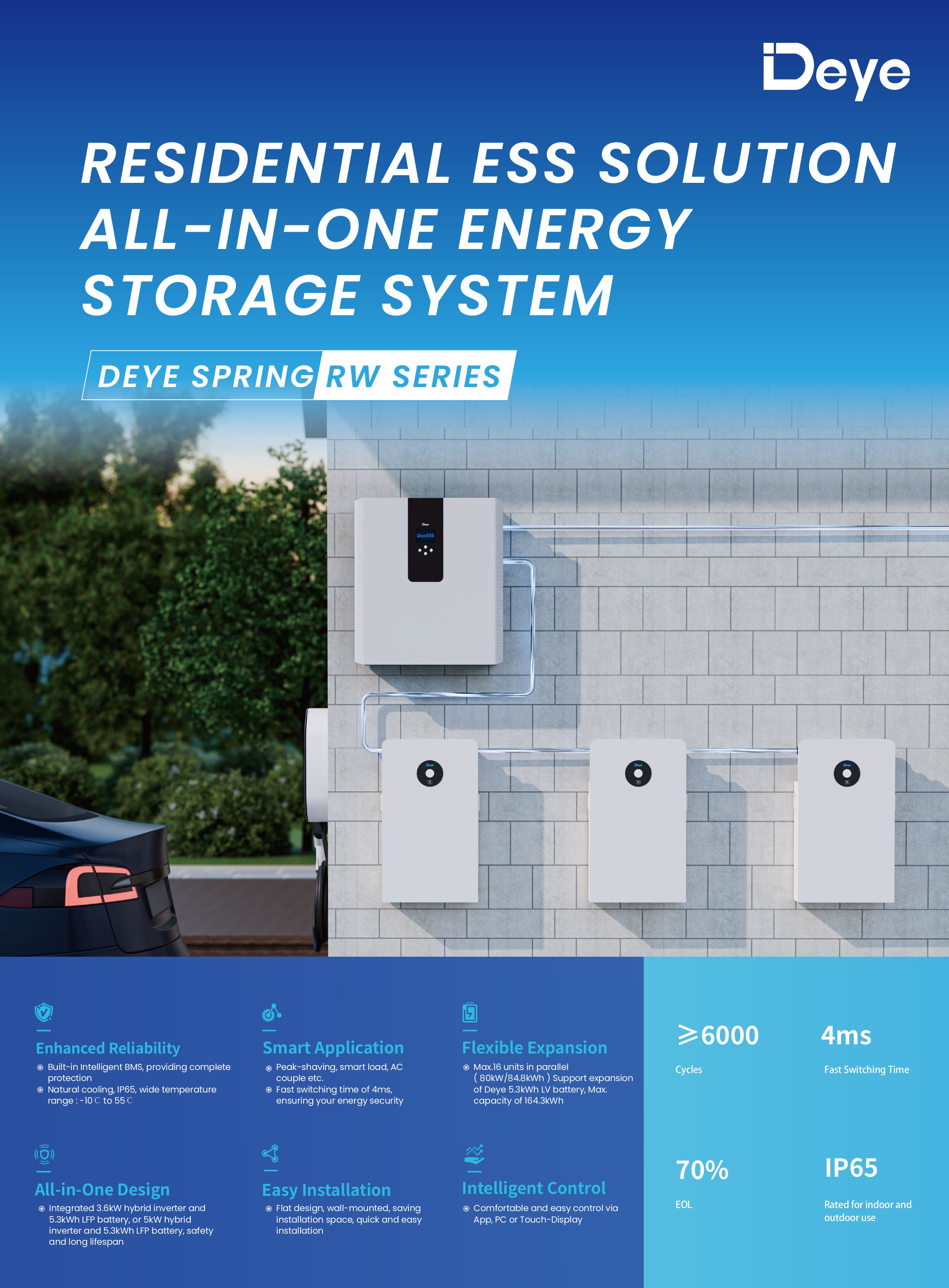 Inverter Hybrid Deye 5kW All-in-One ESS RW-F5.3-1H3 là giải pháp lưu trữ điện mặt trời thông minh “2 trong 1” – kết hợp biến tần hybrid và pin lưu trữ lithium trong cùng một thiết bị. Thiết kế gọn gàng, vận hành ổn định, phù hợp cho cả hộ gia đình, văn phòng và khu dân cư muốn chủ động nguồn điện sạch, tiết kiệm chi phí và đảm bảo an toàn năng lượng.