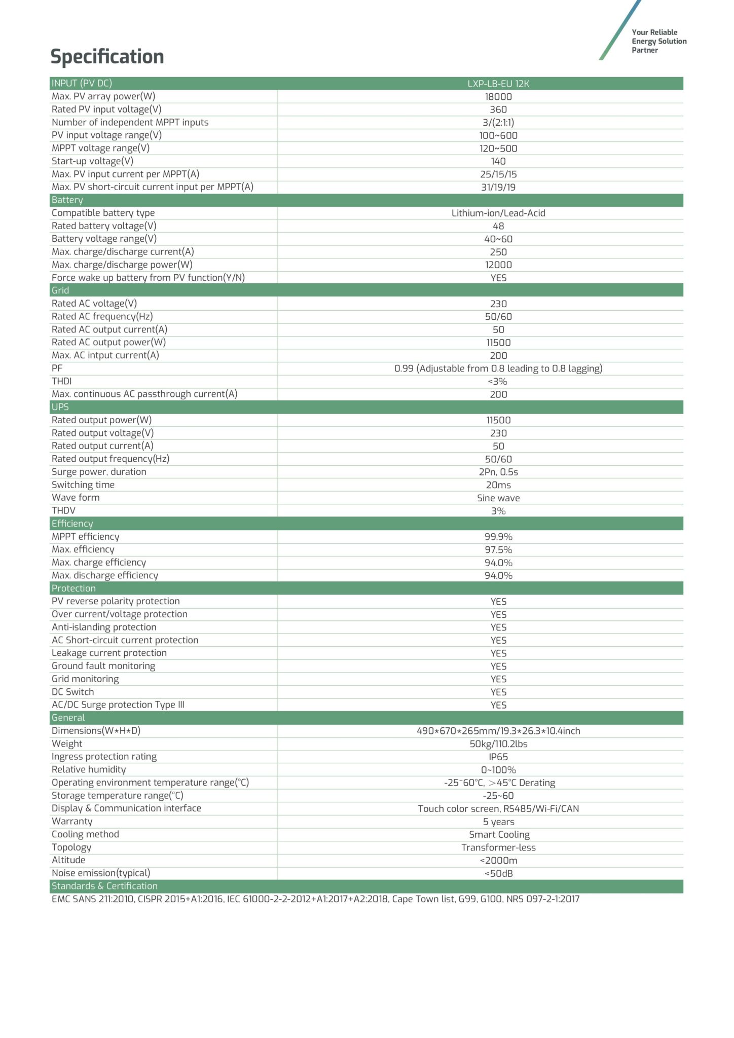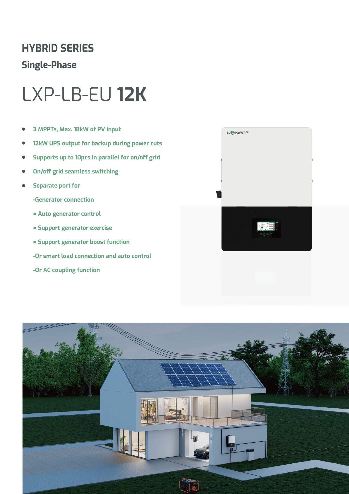 Với khả năng kết hợp thông minh giữa nguồn năng lượng mặt trời, pin lưu trữ và điện lưới, LXP 12K mang đến giải pháp tối ưu giúp người dùng tiết kiệm điện năng, tăng hiệu suất và đảm bảo nguồn điện ổn định 24/7.