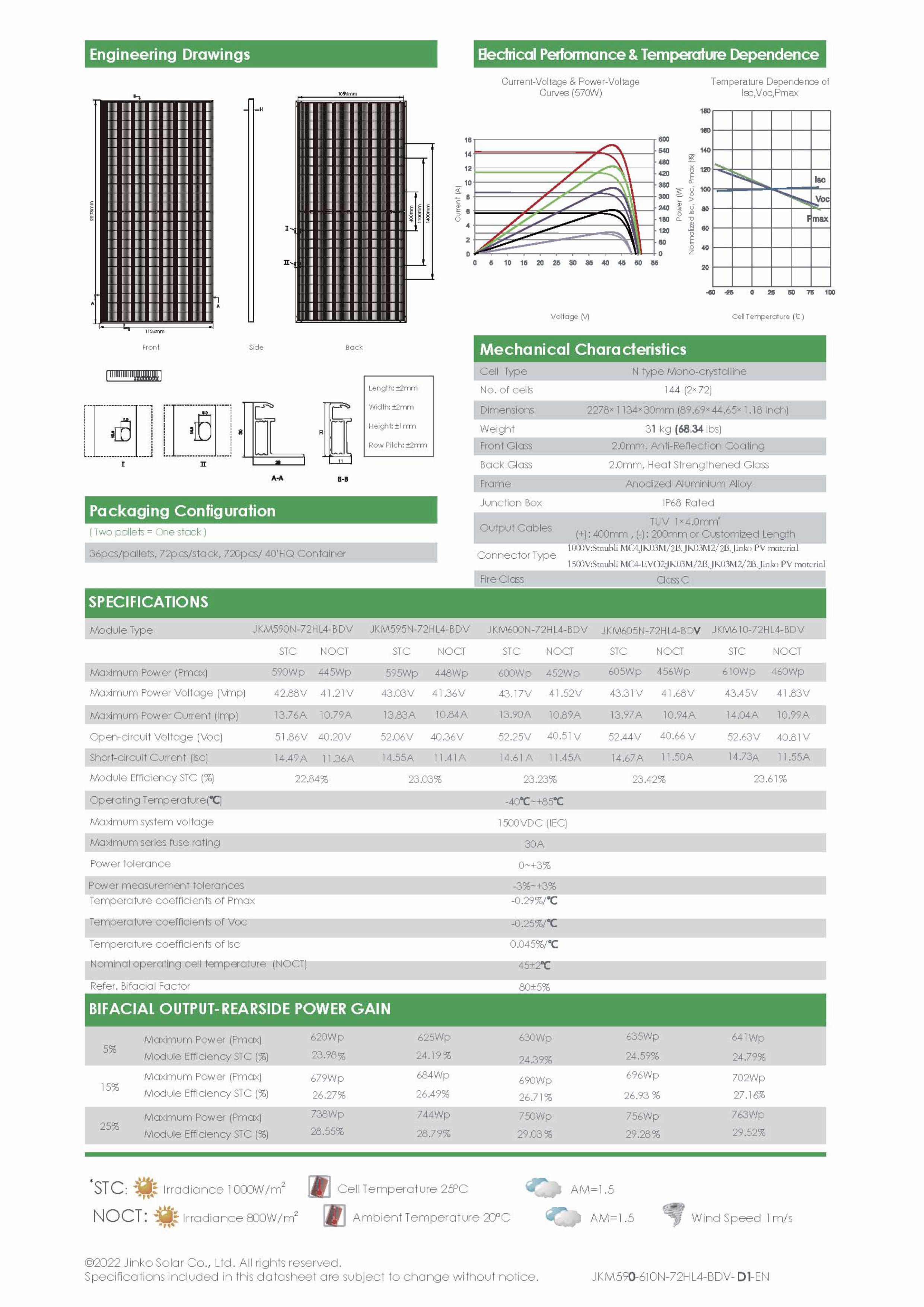 Khi lựa chọn tấm pin năng lượng mặt trời, thông số kỹ thuật là yếu tố quan trọng để đánh giá chất lượng. Jinko 590W JKM590M-72HL4-BDV sở hữu cấu hình mạnh mẽ: