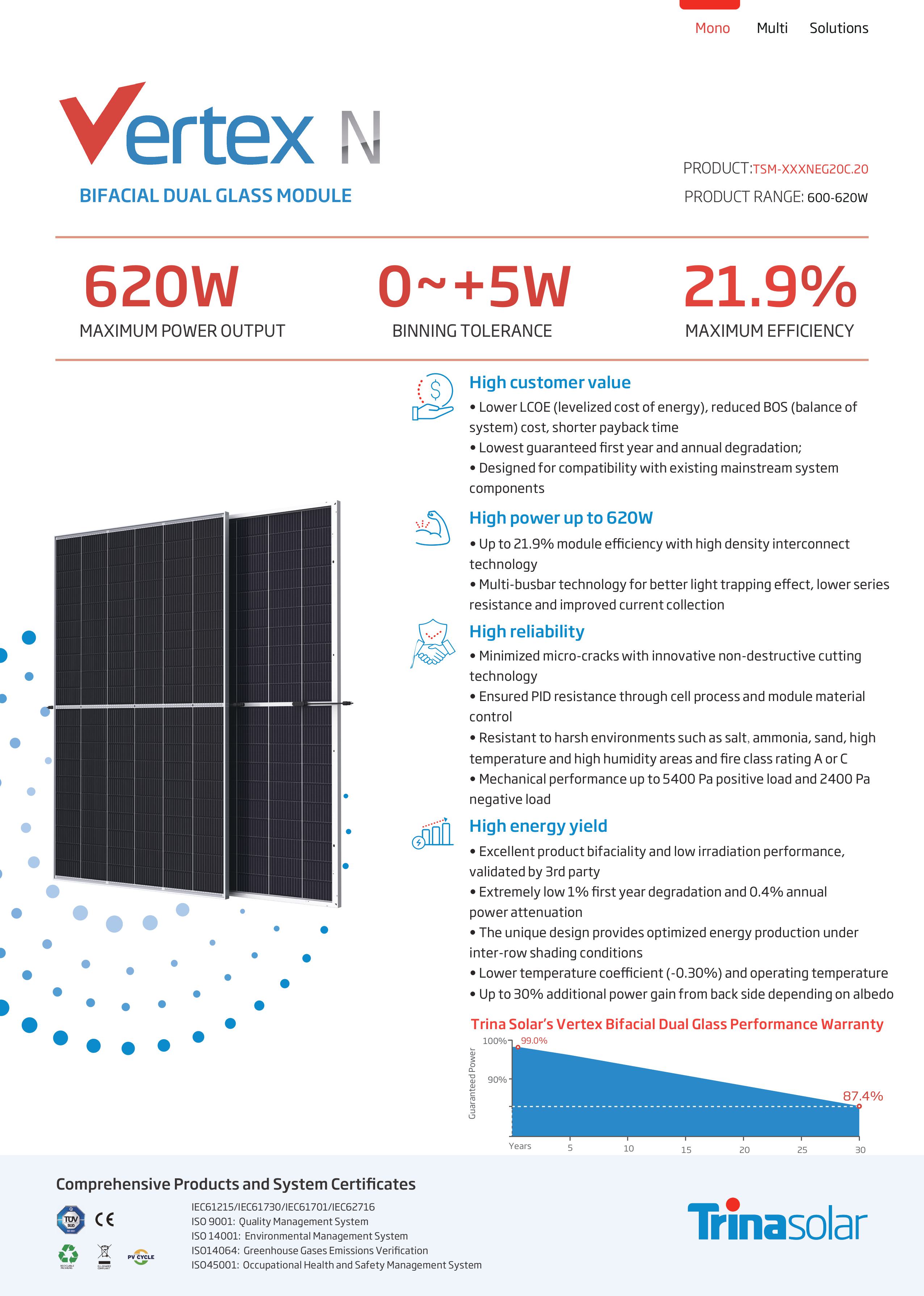 - Công suất mạnh mẽ: 620W giúp tối ưu sản lượng điện với diện tích lắp đặt ít hơn.