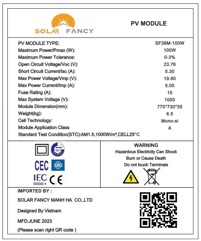 - Công suất 100Wp ổn định – đáp ứng nhu cầu cơ bản như chiếu sáng, sạc điện thoại, quạt mini.
