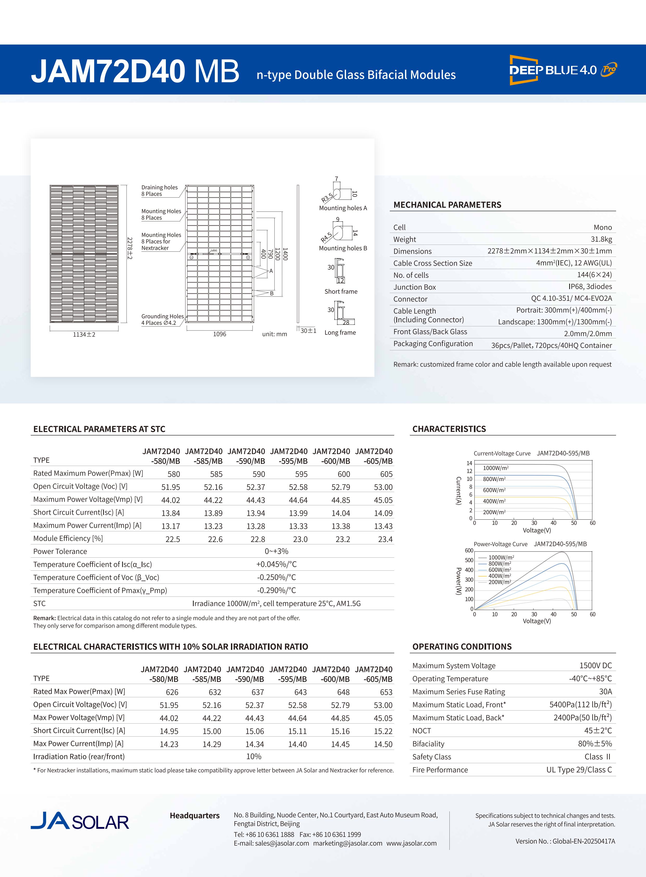 Nhờ cấu trúc tối ưu và độ tin cậy cao, JA Solar 600W là lựa chọn lý tưởng cho các dự án điện mặt trời thương mại, công nghiệp và dân dụng cao cấp, nơi yêu cầu hiệu quả và độ bền vượt trội.