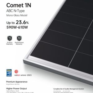 - Ứng dụng công nghệ N-type ABC hiện đại, hiệu suất đạt ~23,5%, cao hơn 1,5–2% so với tấm pin truyền thống.